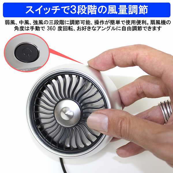 扇風機 車用 車載 車中泊 USB 車内 サーキュレーター クリップファン エアコン カスタム 360度 角度調整 首振り LED シングルファン クリップ 汎用 12V 車内扇風機 ドレスアップ 暑さ対策